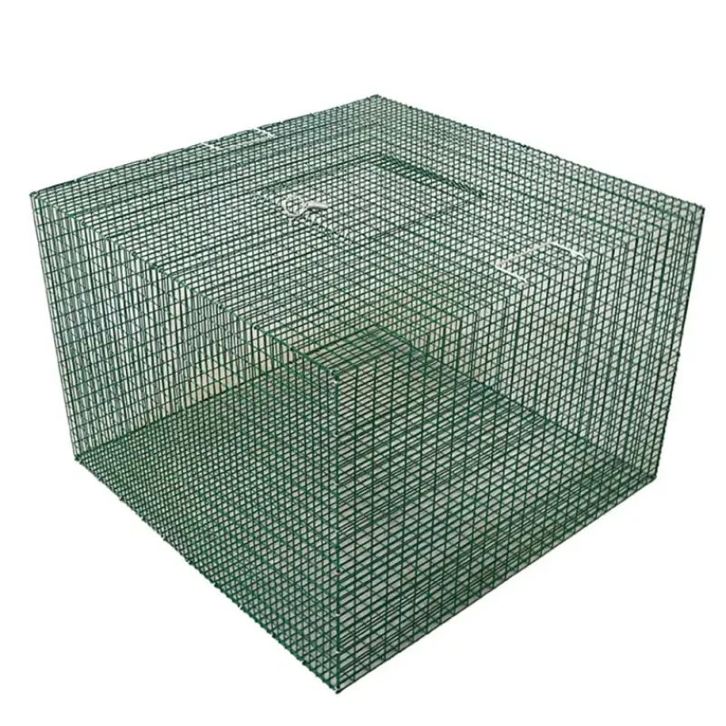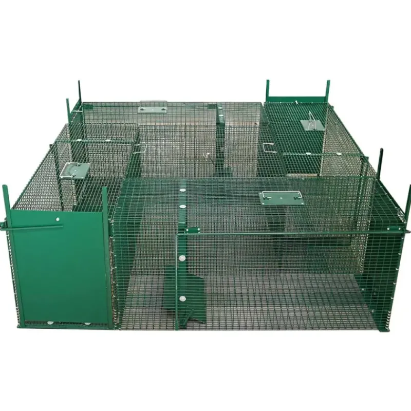 Ce piège est constitué de 4 boîtes à fauves à une entrée et d’une cage centrale à appât vivant avec une trappe sur le dessus.