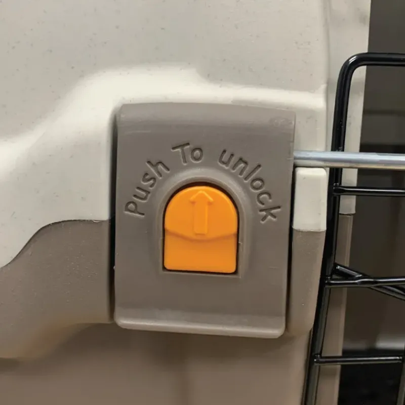 Deux poignées sur la partie haute servent aussi de couvercle aux rangements accessoires (jeu de roulettes ou laisse etc…).