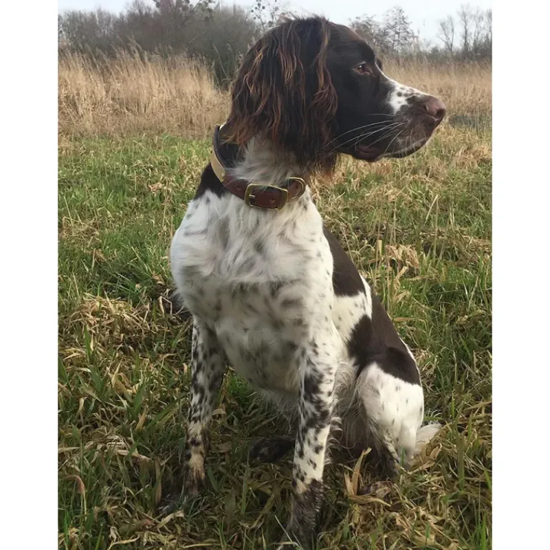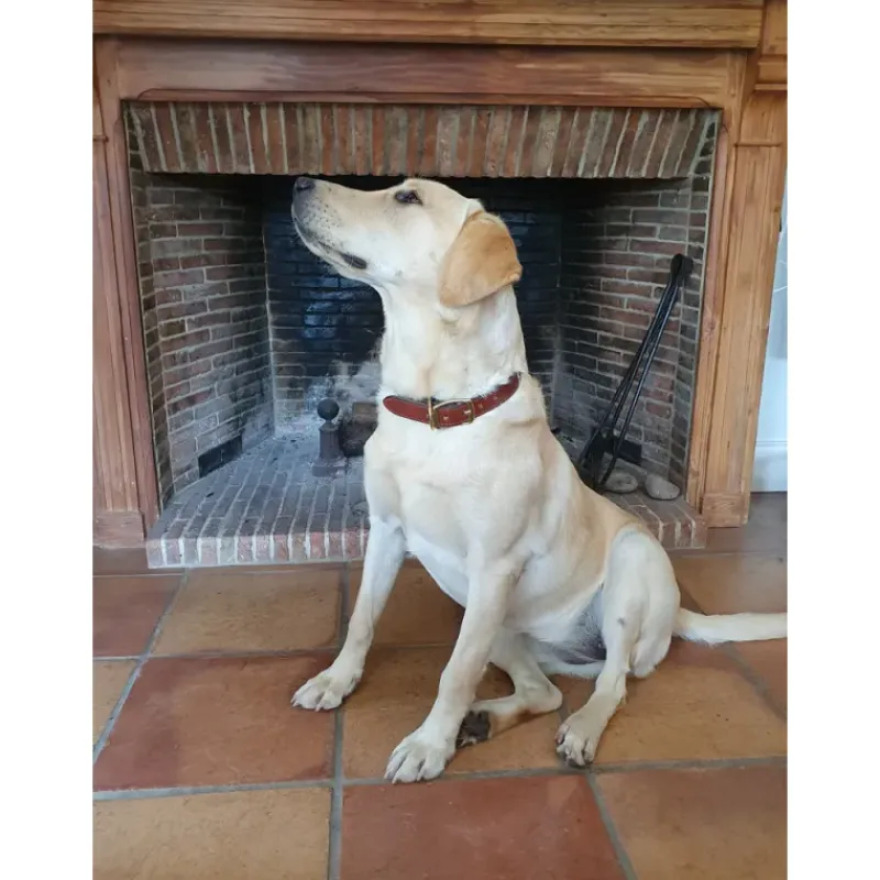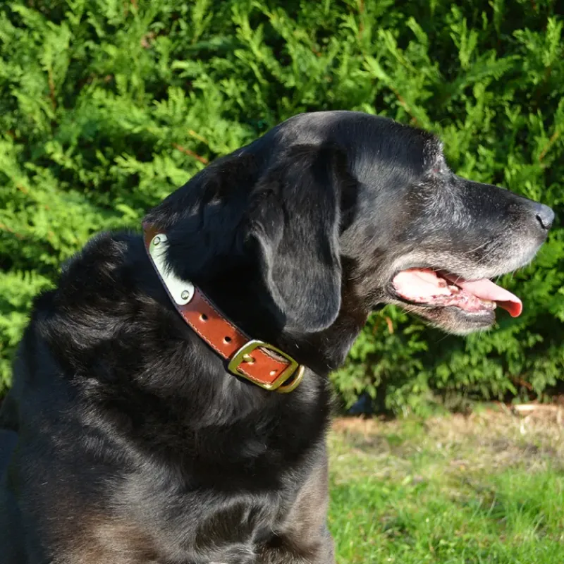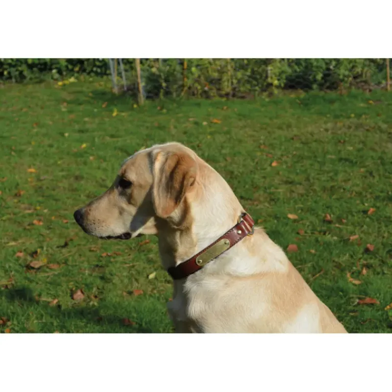 Ces colliers sont livrés avec une plaque d’identification en laiton gravée selon vos instructions et solidement fixée grâce à des rivets en laiton.