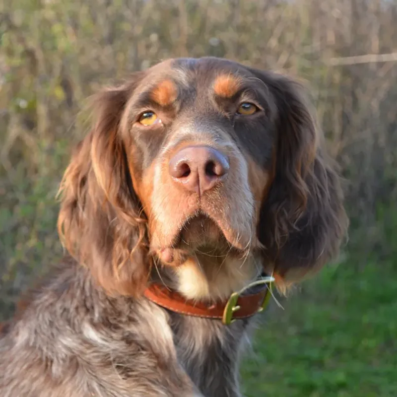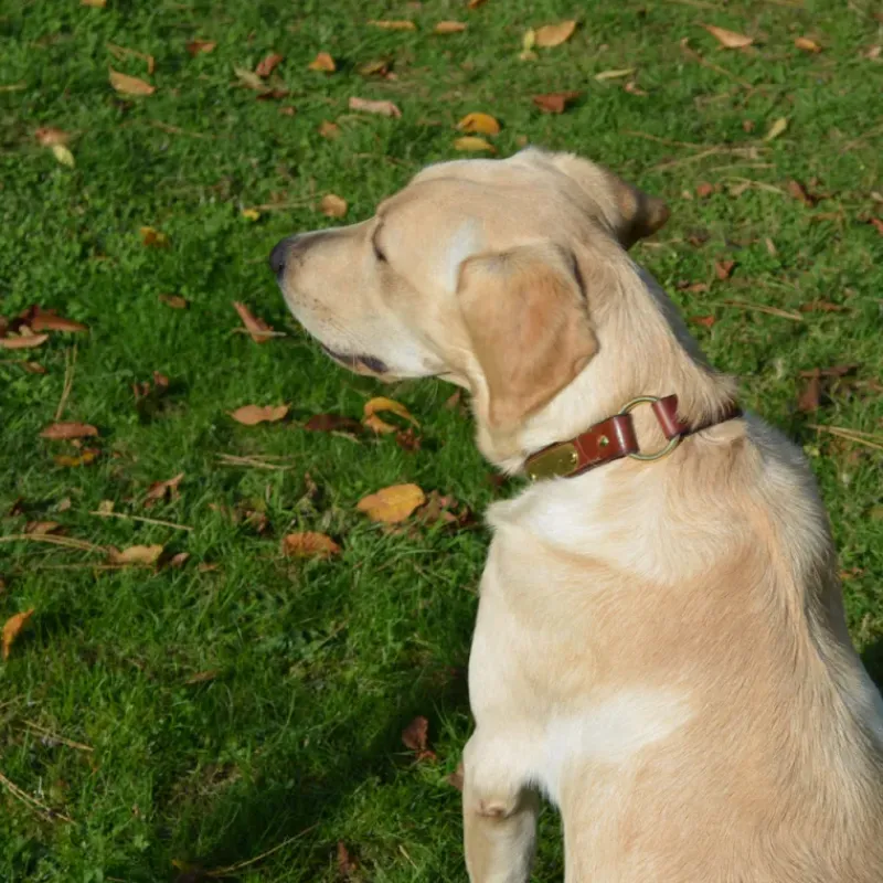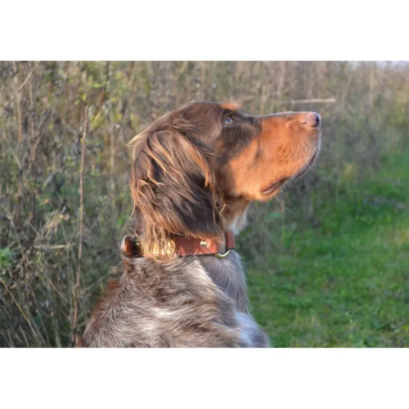 Superbes colliers en cuir coloris noisette, extrêmement durables et résistants, entièrement cousus et rivetés, cuir bordé, bouclerie en laiton massif, anneau central et anneau d’accroche en D.