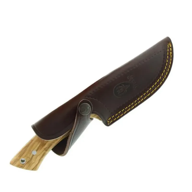 Le couteau de chasse de la célèbre espagnole Muela, avec sa lame large et son manche en olivier.