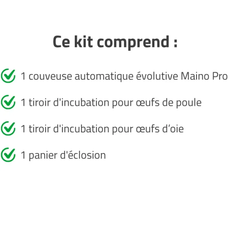 Que vous soyez éleveur débutant ou expérimenté, ce kit couveuse évolutive répond à vos attentes en combinant simplicité d’utilisation, précision et adaptabilité. La capacité peut être étendue jusqu’à 147 œufs. Découvrez également d’autres configurations sur notre site pour répondre à tous vos besoins d’incubation.