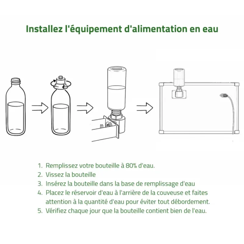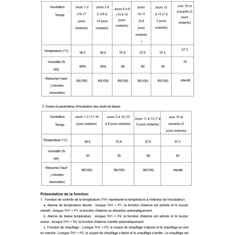 Cette couveuse est équipée d’un panneau de contrôle digital et d’un thermostat électronique pour un réglage ultra-précis de la température. L’humidité est ajustable via un hygrostat, et un réservoir d’eau intégré simplifie son maintien. Les fonctions de programmation intégrées, accompagnées d’une alarme, assurent un suivi sans faille du processus d’incubation.