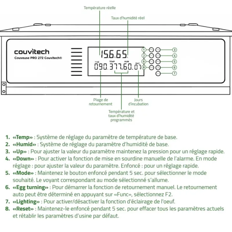 - Capacité : 272 œufs, idéale pour les besoins d’incubation à grande échelle.