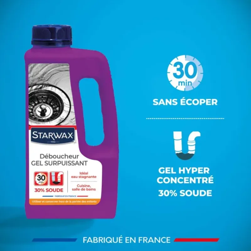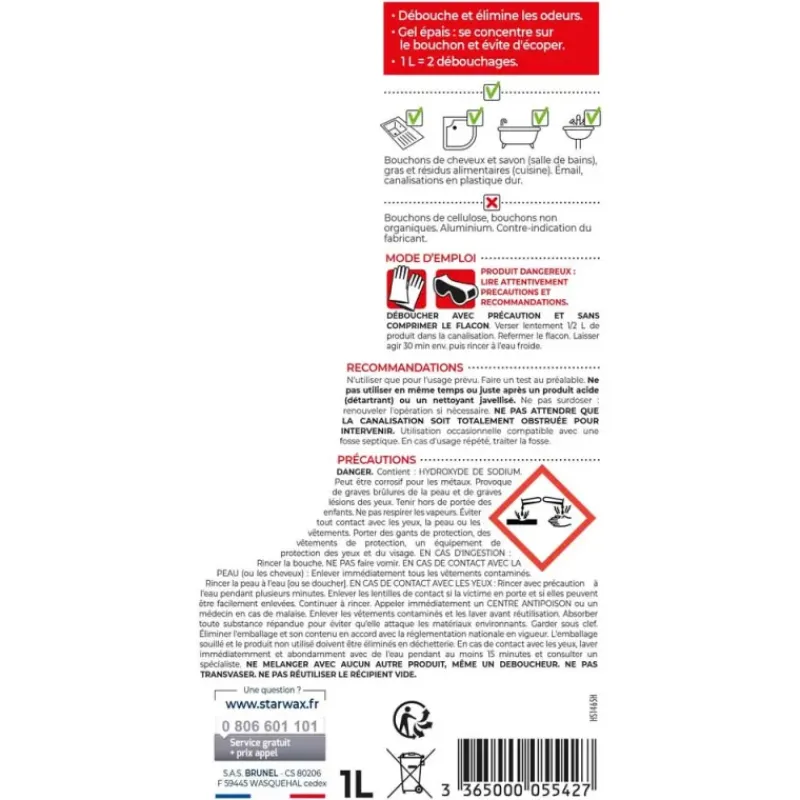 Déboucheur gel surpuissant soude caustique 30% Starwax – Action 30 min 1L