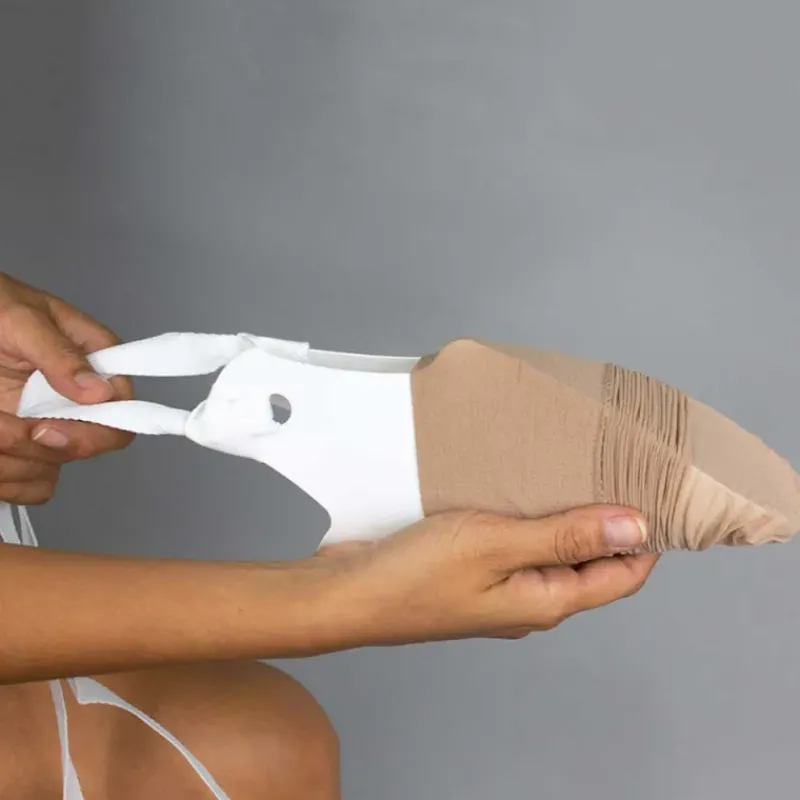 Ces bandes spécialement conçues maintiennent parfaitement le bas ou la chaussette en position, permettant un enfilage progressif et maîtrisé sans risque d’accroc ou de déformation du tissu.