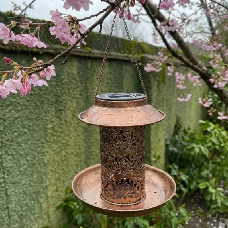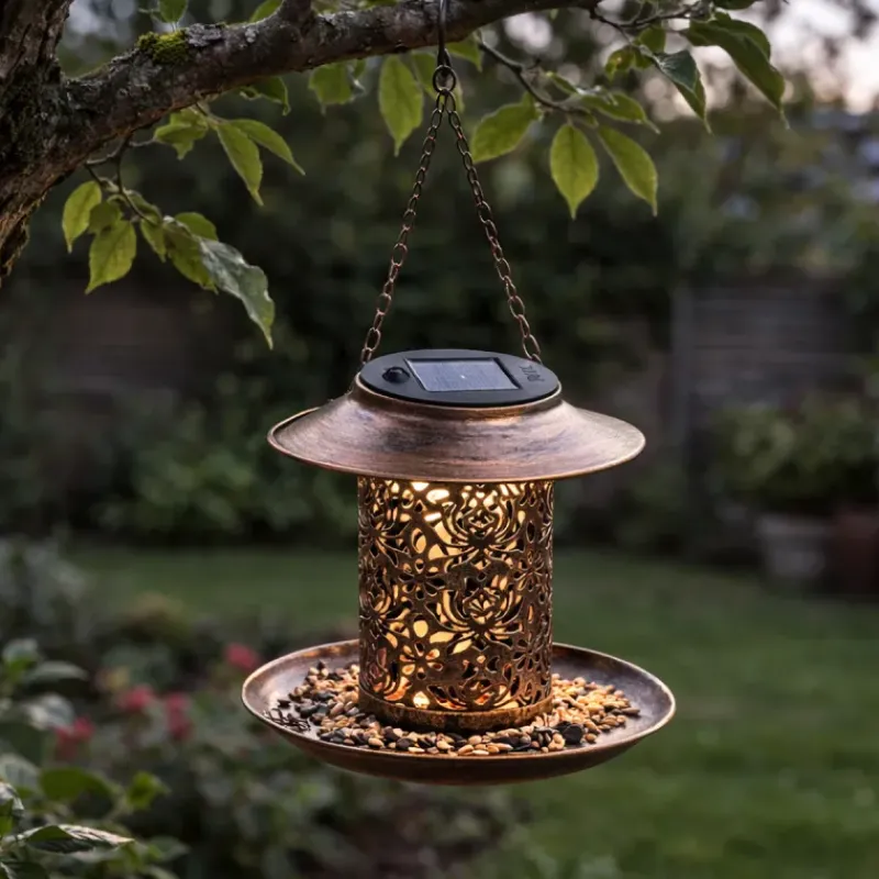Les découpes en forme d’arabesques sur le réservoir permettent aux oiseaux de picorer des graines à la nuit tombée, créant ainsi de magnifiques projections lumineuses autour de la lanterne.