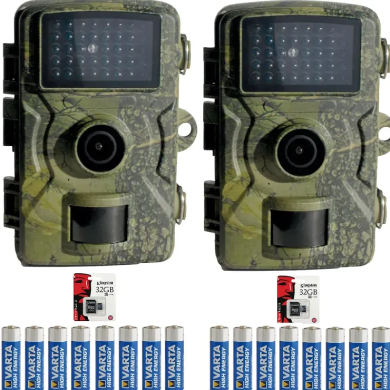 Lot de 2 caméras de chasse 12 MP camouflage avec LEDs invisibles + 16 piles + 2 cartes SD