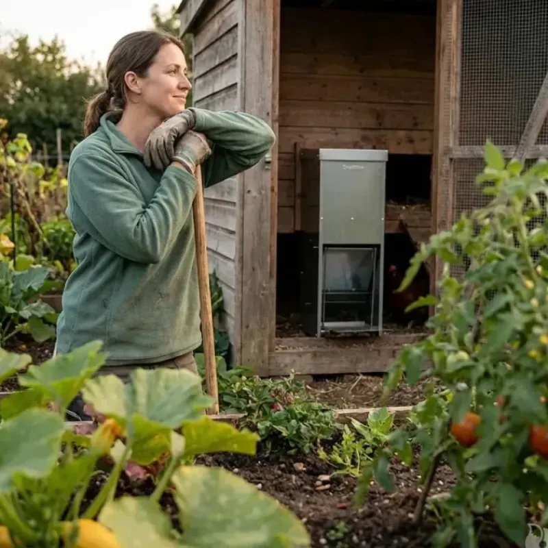 En se plaçant sur la pédale de la mangeoire, le mécanisme d’ouverture s’active, ce qui permet à vos poules de se nourrir.