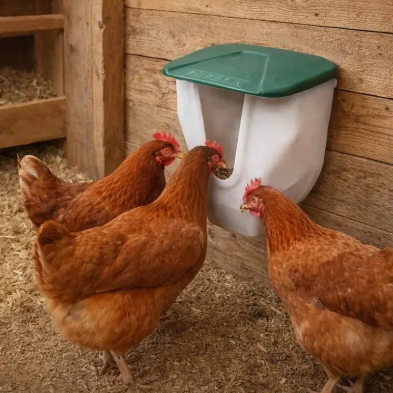 Cette mangeoire pour volailles au design unique est dotée d’un accès à l’aliment spécial en forme de V.