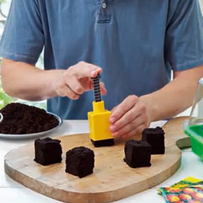 Ce petit presse motte compacte le terreau en un cube, au centre de la petite motte formée, l’appareil crée un petit trou, où planter la graine.
