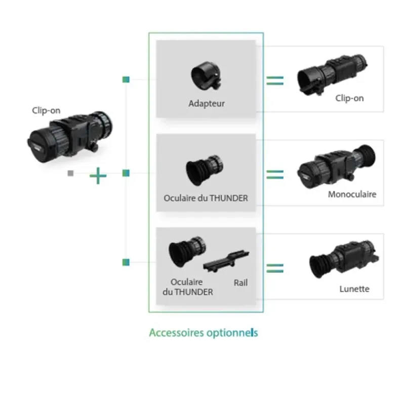 Le concept « clip-on » apporte une polyvalence hors pair en se fixant aisément sur diverses optiques grâce à une bague d’adaptation.