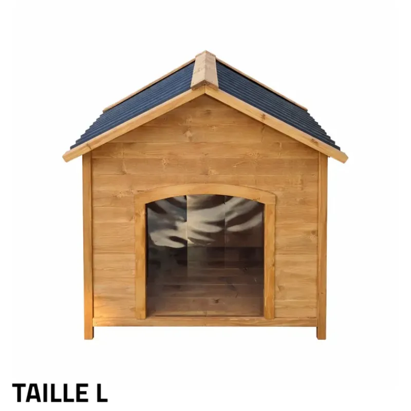 Nettoyez régulièrement la niche avec un chiffon humide. Appliquez une lasure ou un produit de protection pour bois extérieur une fois par an pour préserver la qualité du matériau. Vérifiez périodiquement l’état du toit en PVC et du rideau de porte.