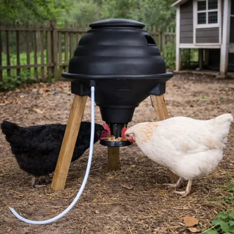 Équipé d’un système unique de drainage permettant de garder les grains au sec avec la possibilité de collecter les eaux de pluie dans un abreuvoir grâce au tuyau fourni.