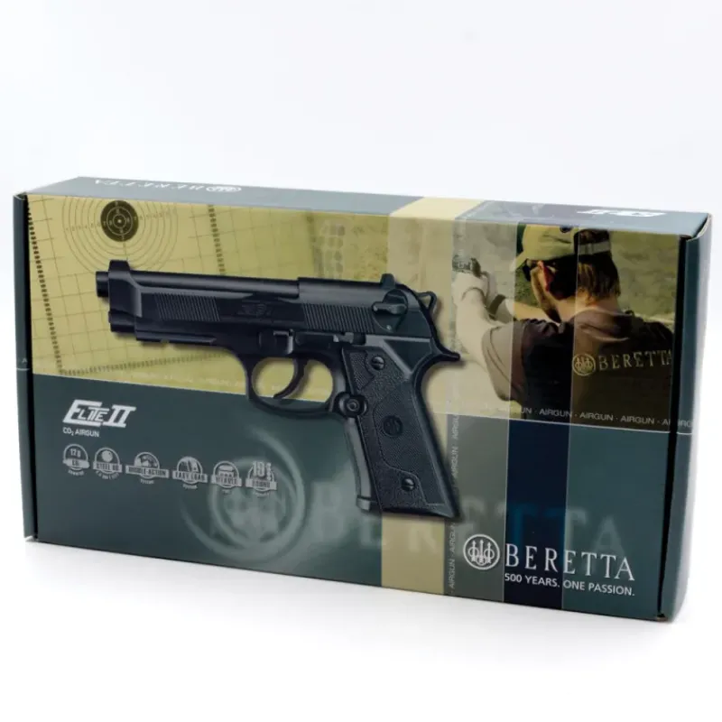 N’hésitez pas à profiter de notre pack spécial Beretta Elite II composé du pistolet Beretta Elite II, de 5 cartouches de CO², d’un biberon de 1500 billes de cuivre, de 100 cibles de tir de 14 x 14 cm et d’une paire de lunettes de protection.