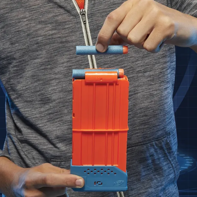 - Chargeur 10 fléchettes + 24 fléchettes Nerf Elite incluses (14 de rechange).