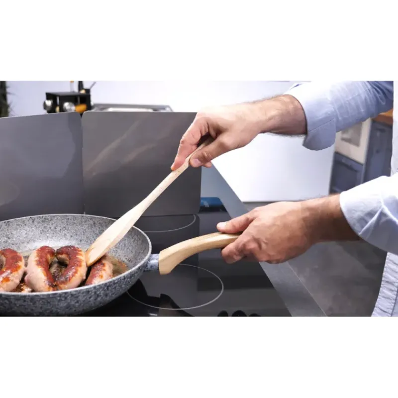 La protection anti-éclaboussures se place tout simplement autour de la poêle ou de la casserole et protège ainsi non seulement la table de cuisson mais aussi les murs environnants.