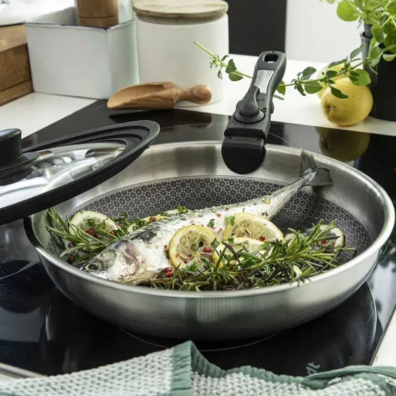 Optez pour cette poêle en acier inoxydable à fond en nid d’abeille et profitez d’une cuisson exceptionnelle, saine et uniforme.