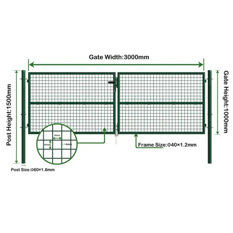 Ce portail 2 vantaux grillagé, d’une dimension de 3 mètres de large sur 1 mètre de haut, est conçu pour sécuriser efficacement votre propriété. Il est doté d’une maille de 50 x 50 mm et d’un fil d’un diamètre de 4 mm, garantissant robustesse et durabilité.