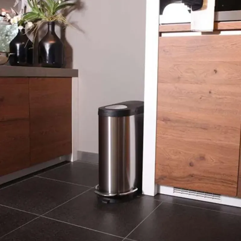 Grâce à ses deux compartiments séparés (20 L + 16 L), cette poubelle permet de trier facilement les déchets ménagers et les matières recyclables. Elle constitue une solution idéale pour adopter une organisation plus écologique et garder un espace propre et bien structuré.