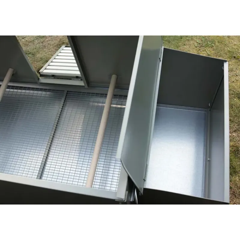 Il est conçu pour un nettoyage parfait et très aisé : la grille du sol permet l’ouverture du tiroir sans déranger les poules.