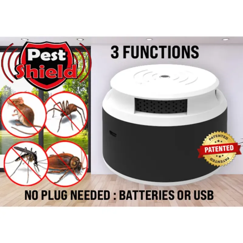Répulsif sans fil qui génère un bouclier d’ultrasons, permettant de repousser les nuisibles de votre maison (araignées, cafards, rats, souris).