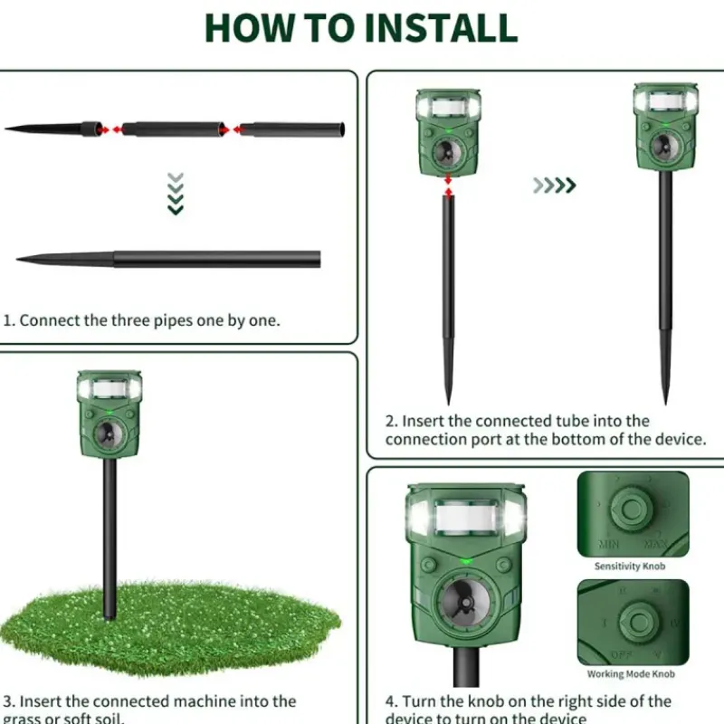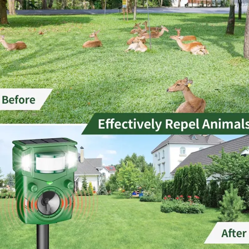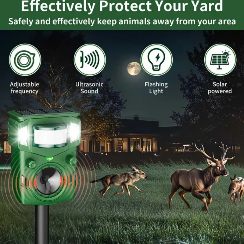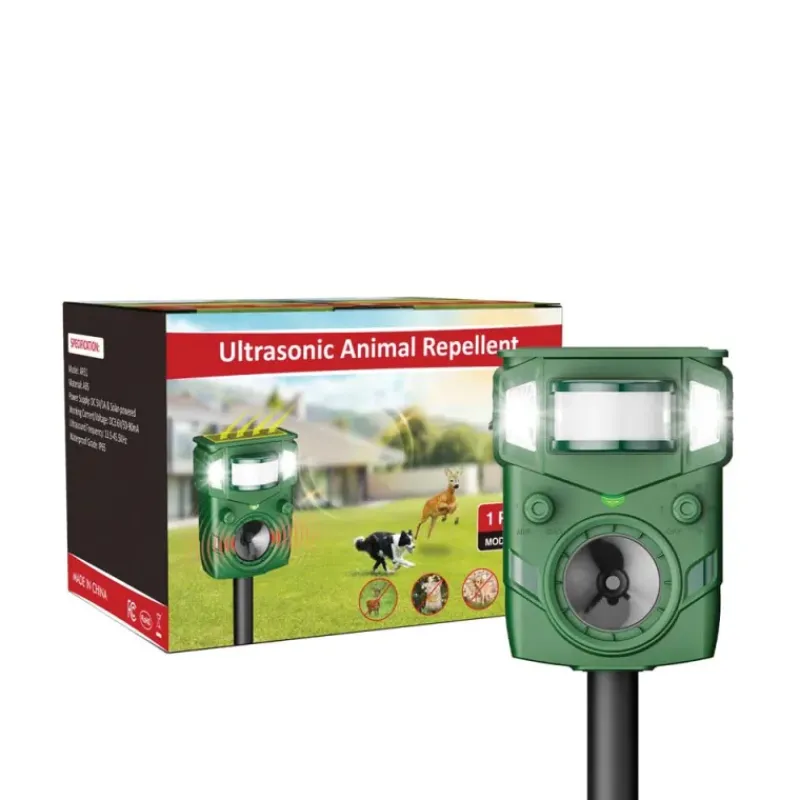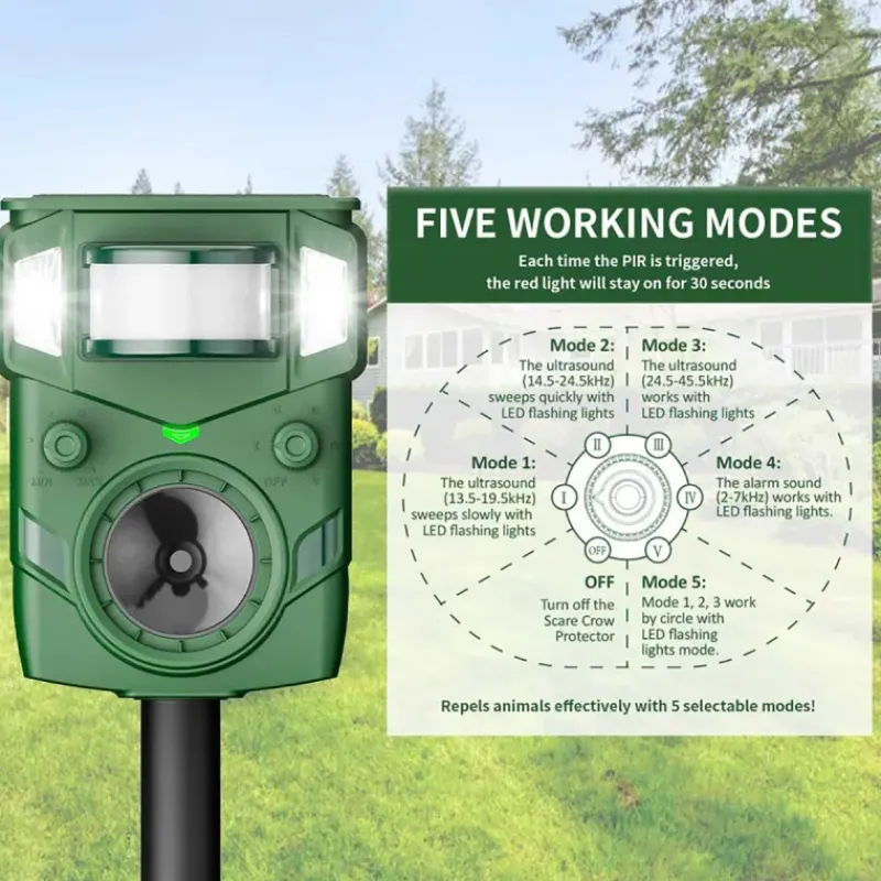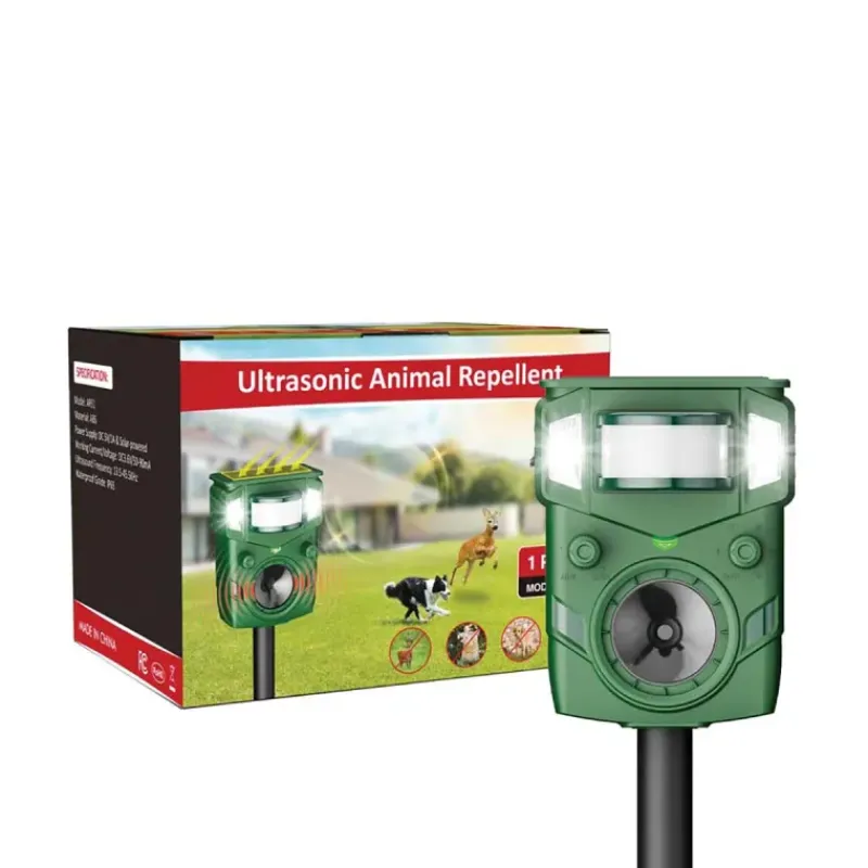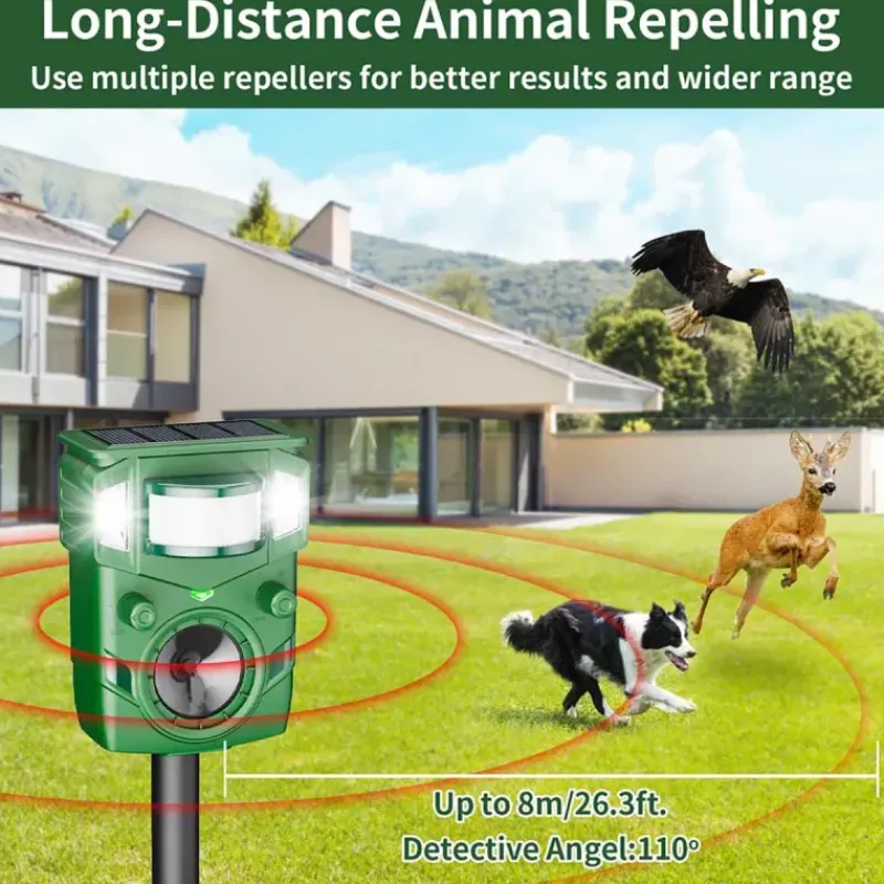 Ce répulsif combine deux technologies puissantes : des ultrasons (fréquence variable de 13,5 à 45,5 KHz) et un flash lumineux clignotant pour perturber et éloigner les animaux indésirables sans leur causer de dommages.