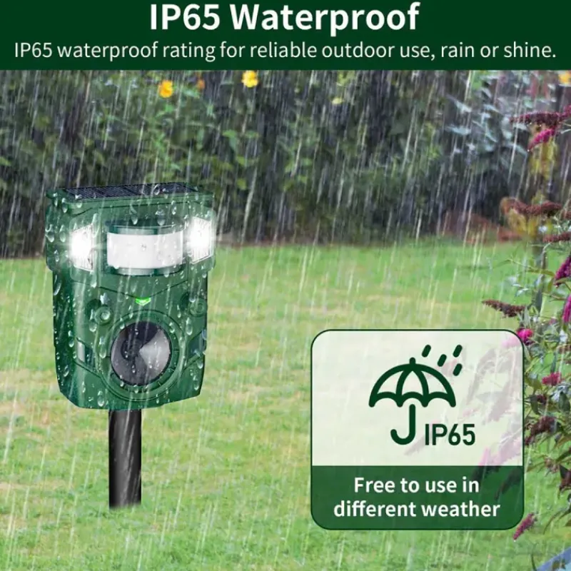 Conçu pour résister aux intempéries, ce répulsif possède un indice de protection IP65, garantissant une utilisation en extérieur par tous les temps.