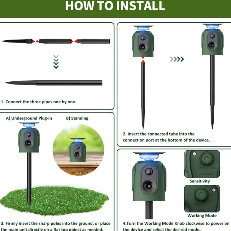 Facile à installer, ce répulsif ne nécessite aucun entretien particulier. Placez-le dans la zone à protéger et laissez-le fonctionner automatiquement. Une solution pratique pour éloigner les nuisibles sans effort.