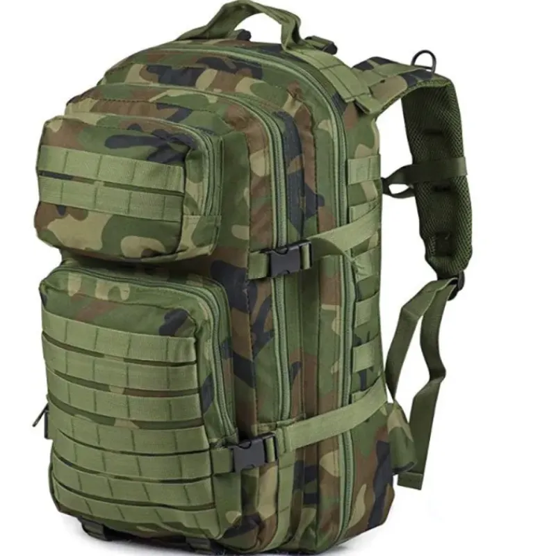 Sur le devant de ce sac camouflage, on a 2 compartiments supplémentaires avec fixations-Molle et des sangles de compression sur les côtés afin de contrôler le volume.