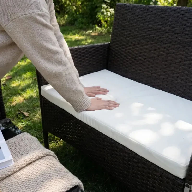 Ce salon de jardin comprend 2 chaises, 1 canapé deux places et 1 table basse, offrant un agencement harmonieux et fonctionnel pour vos moments de détente.