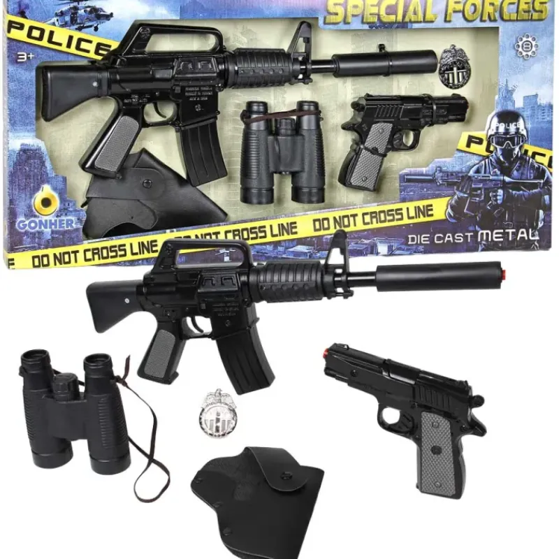 Le kit comprend une mitraillette et un pistolet factices pour l’apprentissage des gestes de sécurité, accompagnés d’un holster pratique pour le transport du pistolet.