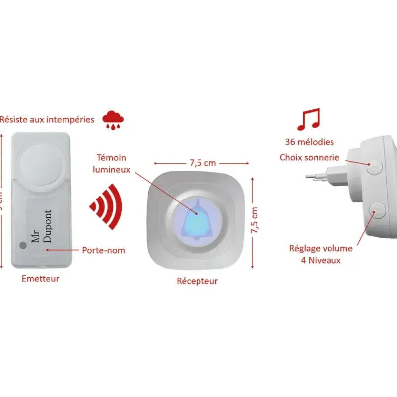 Vous installez l’émetteur (la sonnette) où bon vous semble, sur votre porte d’entrée ou près de votre portail extérieur ; il ne craint pas les intempéries.