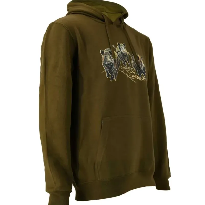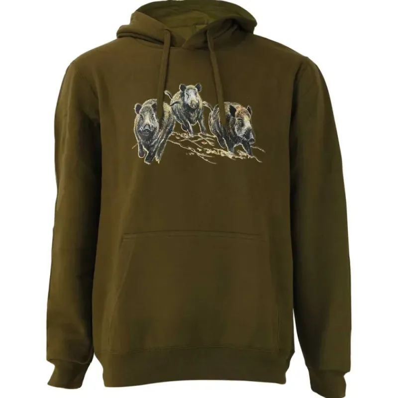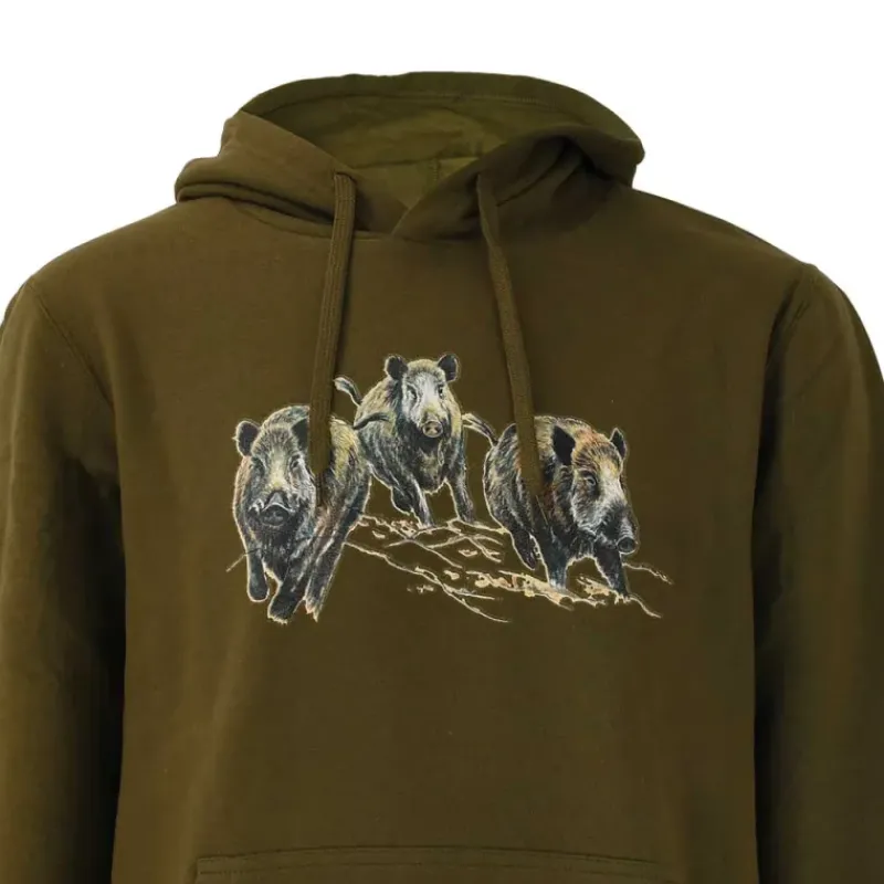 - Le motif de trois sangliers courants sur ce sweat-shirt à capuche kaki apporte une touche originale et authentique à votre garde-robe.