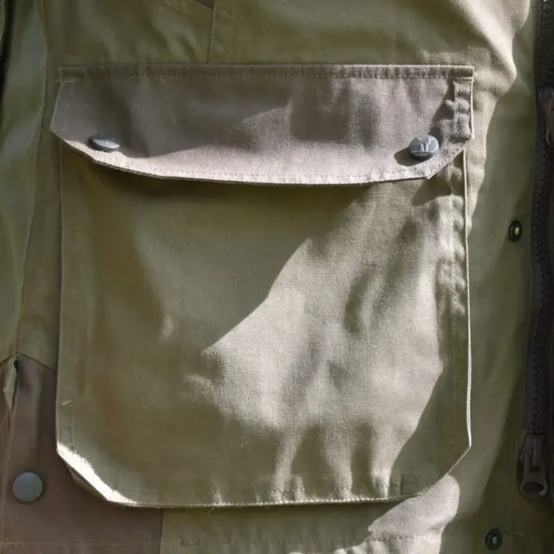 Élégante, ce blouson ne dispose pas d’empiècements, mais différentes nuances de kaki sont présentes au niveau des rabats des poches, sous les bras, sur la poche poitrine et dans le bas du blouson.