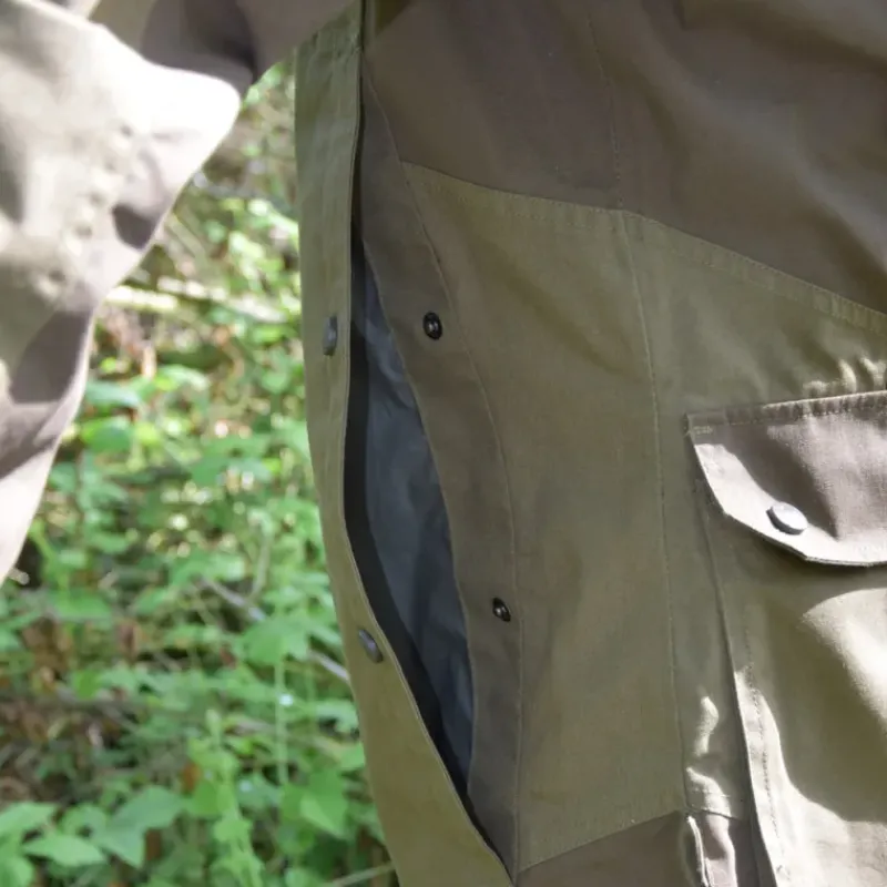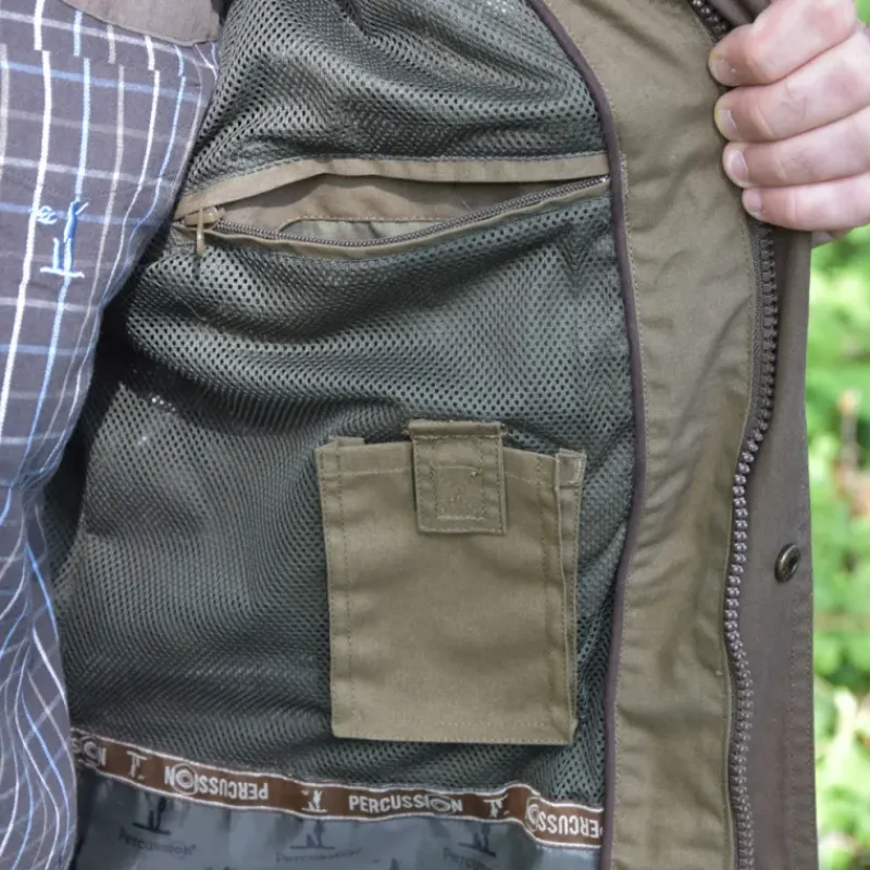 - Ce blouson de chasse a de nombreux avantages, avec une capuche intégrée dans le col, des œillets de ventilation sous les bras, un anneau porte-gibier ainsi qu’un carnier dans le dos doublé en PVC.