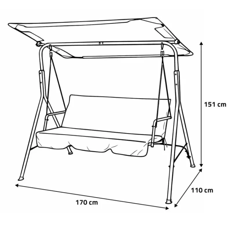 Avec des dimensions de 170 x 110 x 151 cm, cette balancelle offre un espace généreux pour s’asseoir confortablement. La hauteur d’assise est de 52 cm, idéale pour une position détendue. Son design ergonomique permet de profiter pleinement des journées ensoleillées ou des soirées d’été.