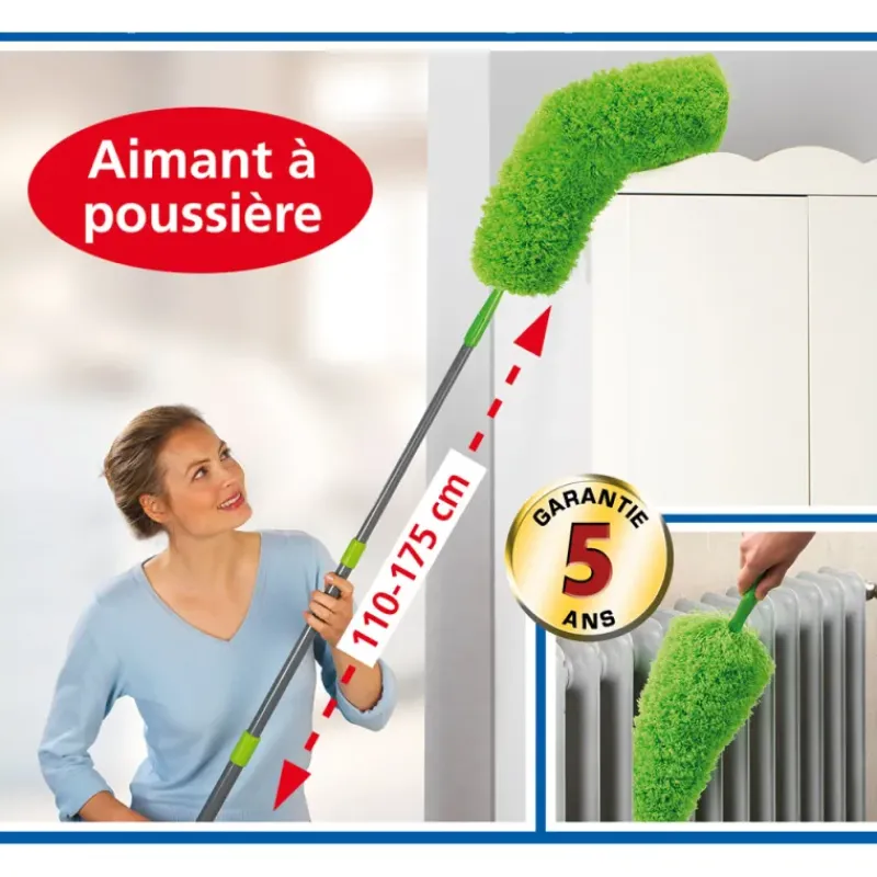 Grâce à son manche extensible de 110 à 175 cm et au plumeau pliable jusqu’à 90 degrés, vous pourrez atteindre des endroits difficiles comme sous les commodes, derrière les armoires ou les radiateurs.