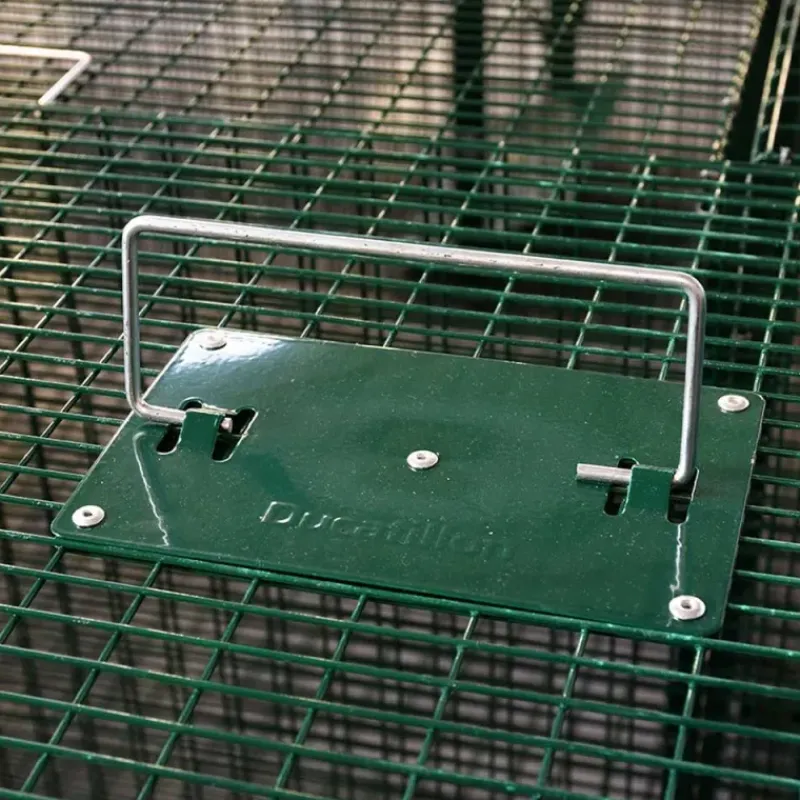 Ce piège est constitué de 4 boîtes à fauves à une entrée et d’une cage centrale à appât vivant avec une trappe sur le dessus.