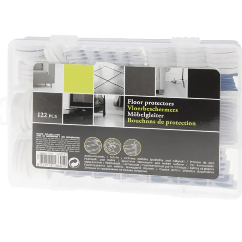 Cette boîte contient 122 patins de protection en feutre, idéaux pour préserver vos sols des rayures et des traces causées par le déplacement de meubles. Parfaits pour une utilisation domestique ou professionnelle.