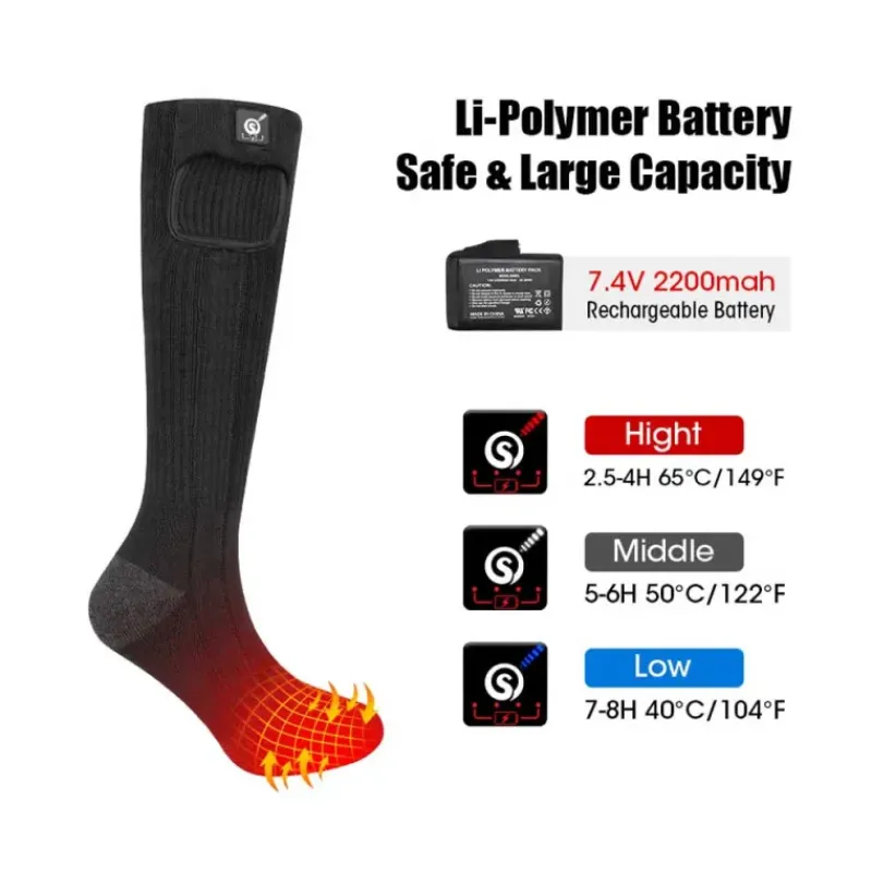 Équipées de 2 batteries 7,4 V et d’un chargeur inclus, ces chaussettes vous accompagnent lors de vos activités en extérieur ou pour un usage quotidien. Profitez de 3 niveaux de température pour adapter la chaleur selon vos besoins.