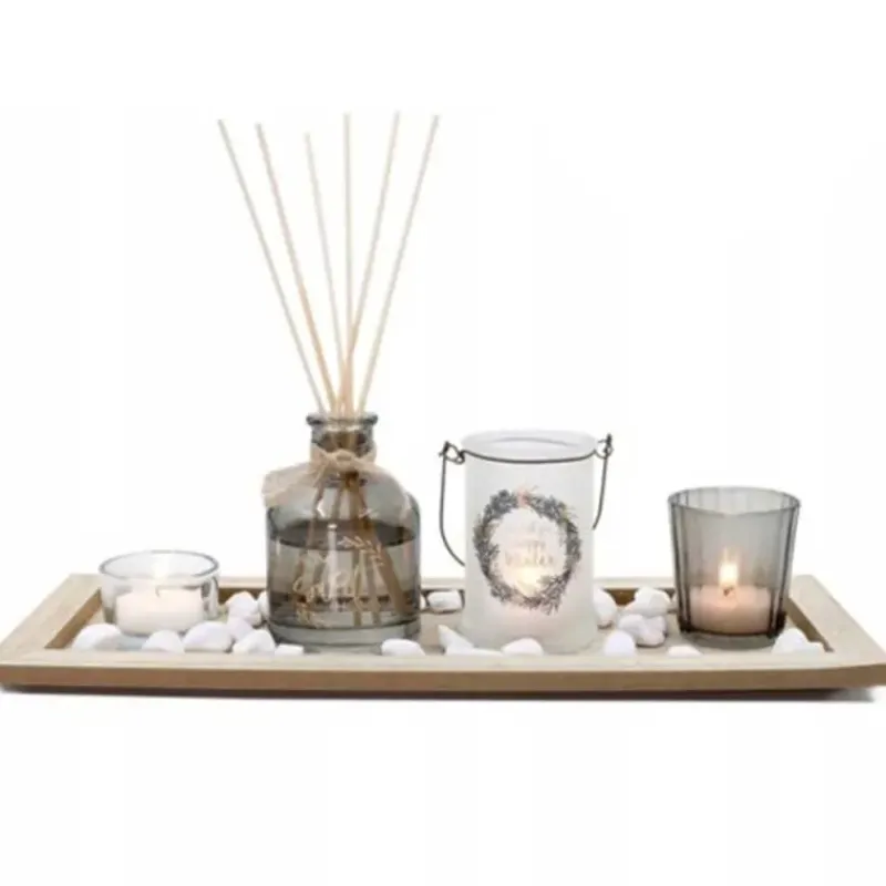 - Contenu : diffuseur 100 ml, 2 bougeoirs en verre, 3 bougies chauffe-plat, plateau bois, pierres décoratives