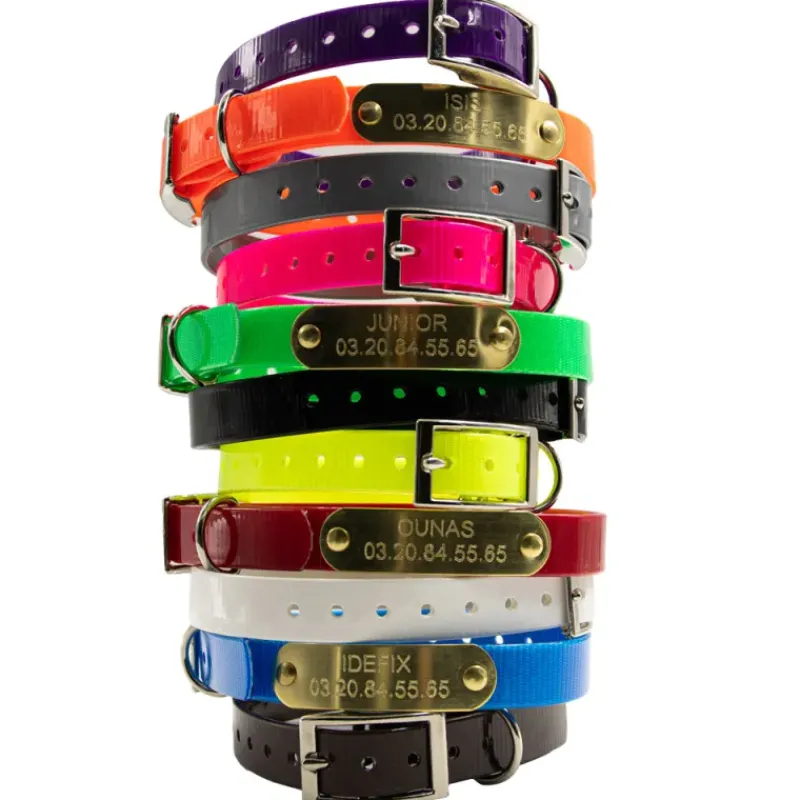 Collier en sangle Biogold de la marque BioThane dont les dimensions sont adaptées aux chiots et petits chiens, équipé d’une plaque en laiton rivetée au collier et gravée selon vos instructions (sur 2 lignes).