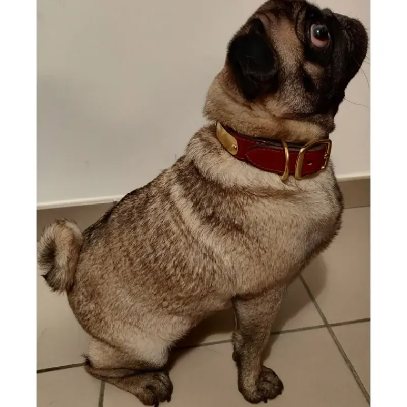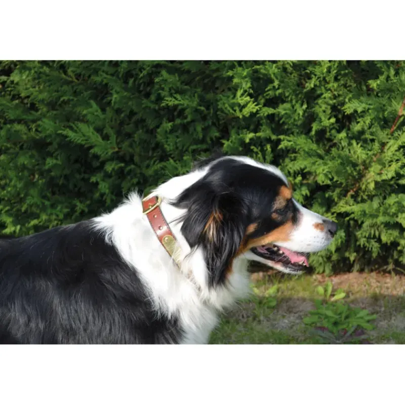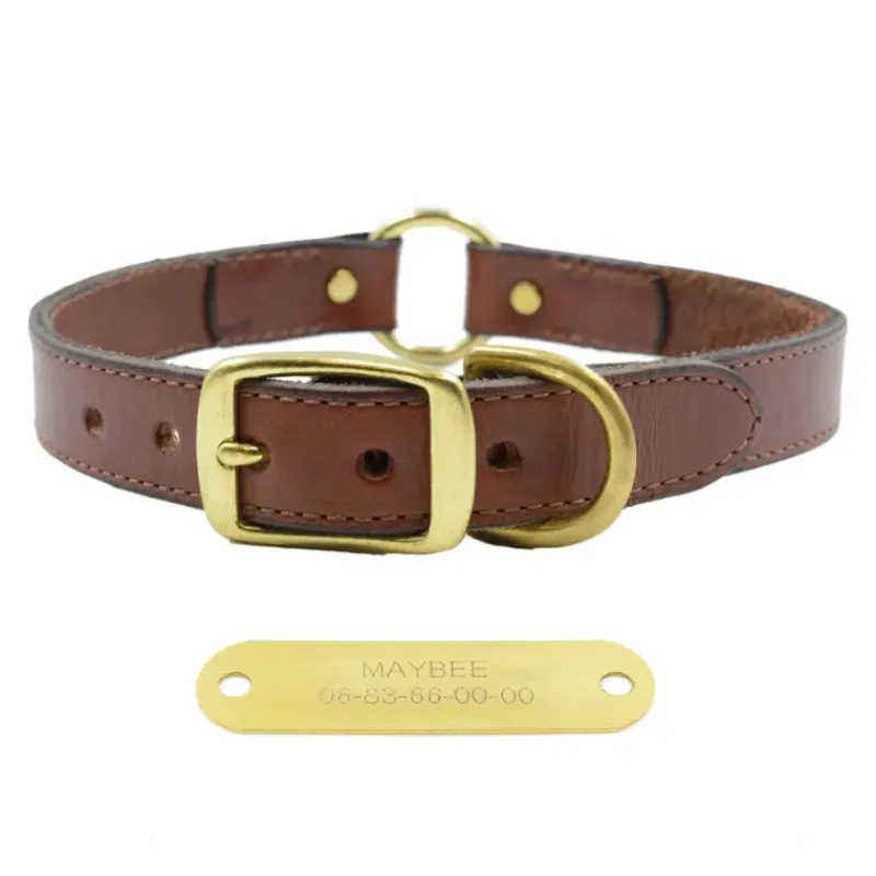 Ces colliers sont livrés avec une plaque d’identification en laiton gravée selon vos instructions et solidement fixée grâce à des rivets en laiton.
