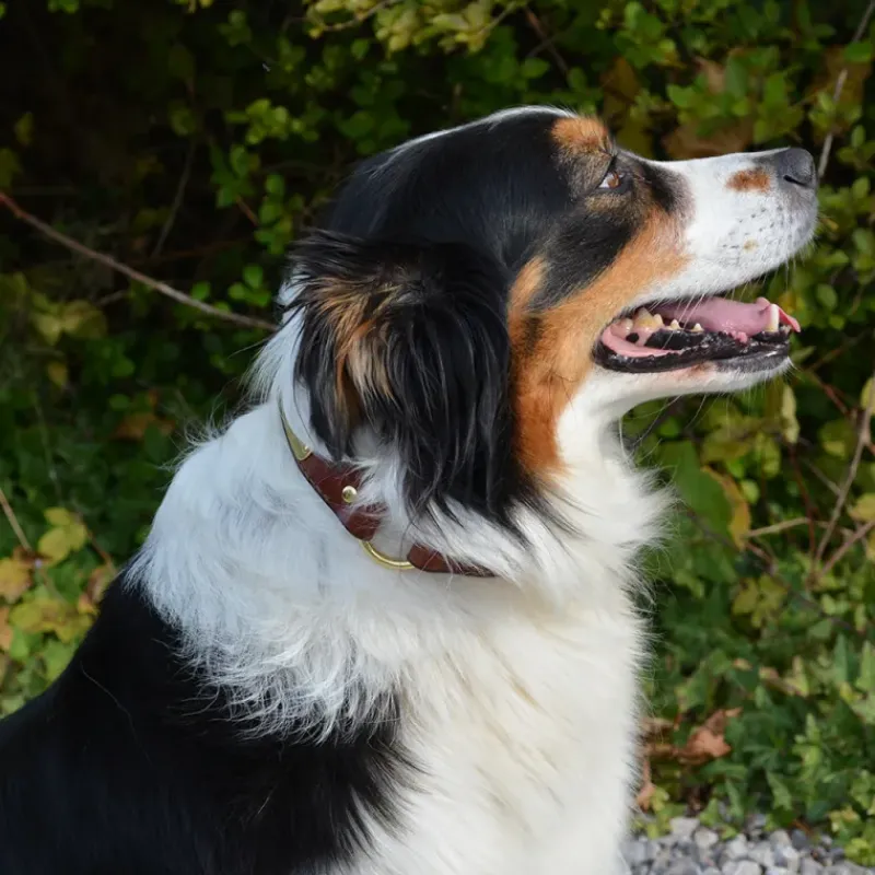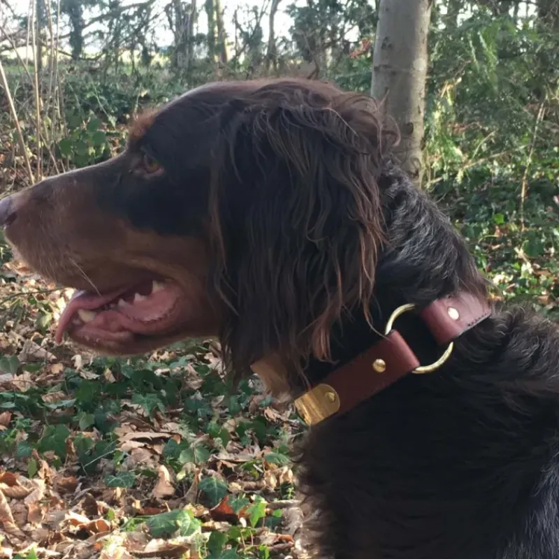 Superbes colliers en cuir coloris noisette, extrêmement durables et résistants, entièrement cousus et rivetés, cuir bordé, bouclerie en laiton massif, anneau central et anneau d’accroche en D.