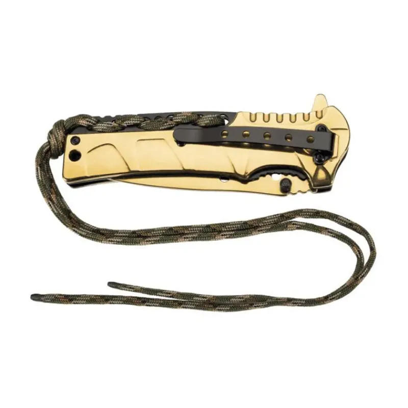 Couteau HERBERTZ, lame à trous en acier 3Cr13MoV doré brillant avec « flipper » à cran intérieur et à bouton double, manche de 12 cm en acier inox doré, avec clip et lacet paracord.