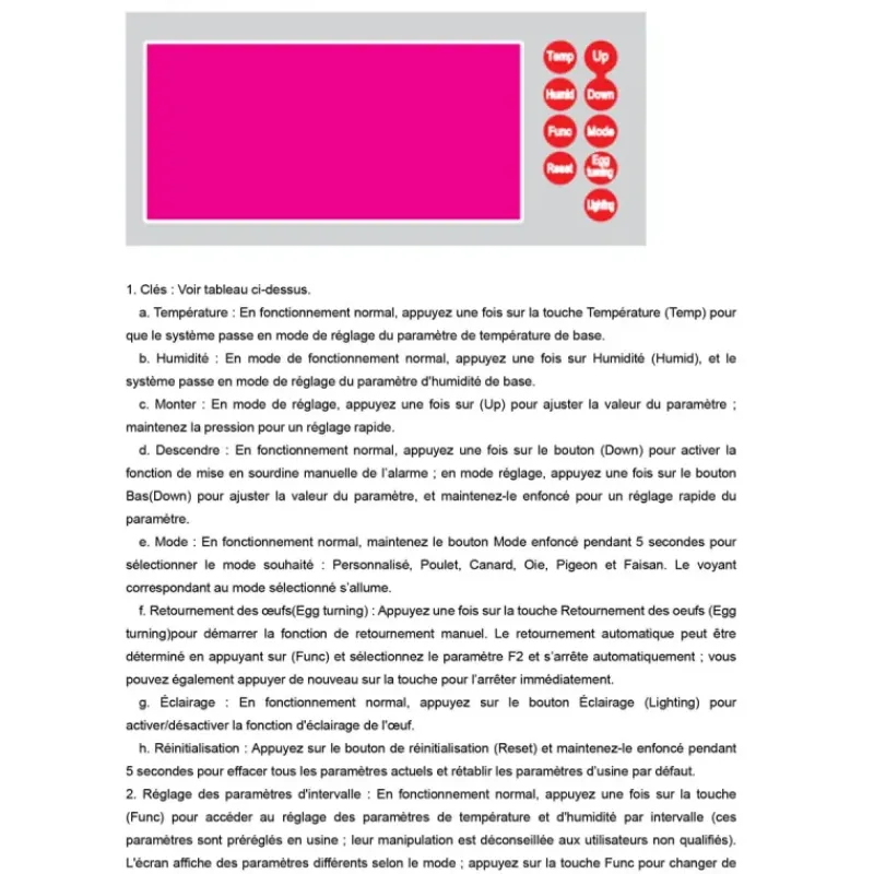 - Contrôle précis : Panneau de contrôle digital avec thermostat électronique pour un réglage fin de la température et hygrostat ajustable pour l’humidité.