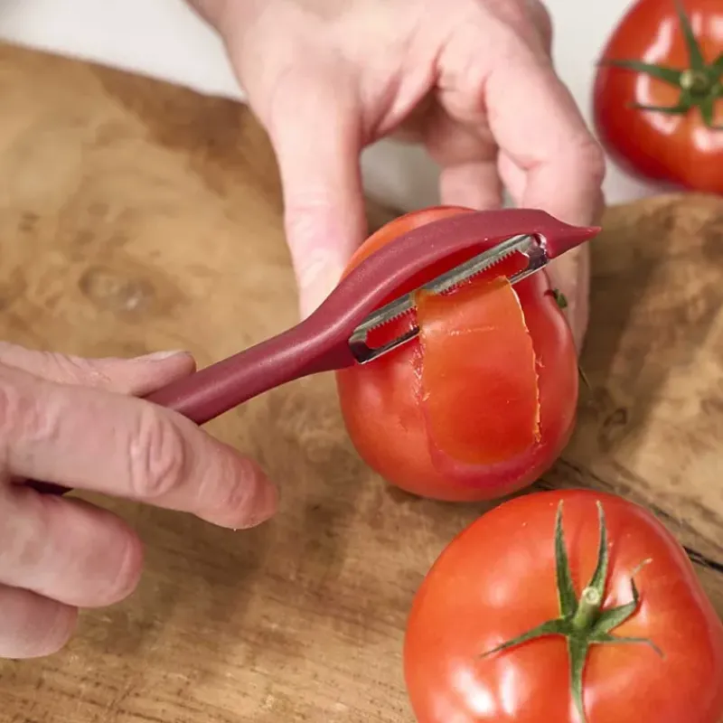 Grâce à sa lame en acier inoxydable à double denture pivotante, il permet d’éplucher rapidement et sans effort vos fruits et légumes à peaux fines et délicates, comme les tomates, poivrons, kiwis ou pêches.