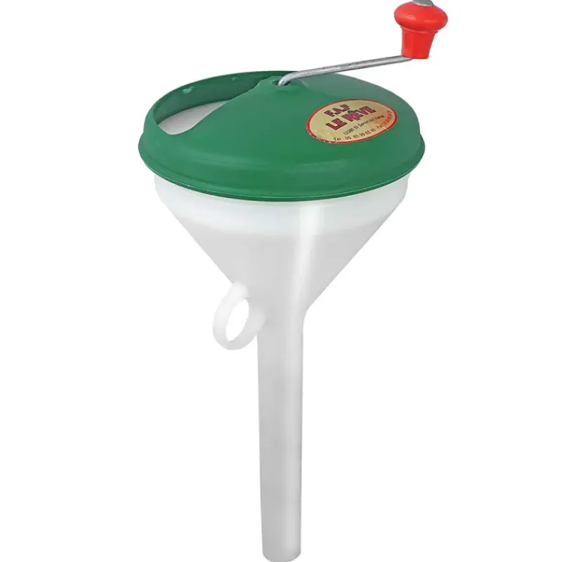 Très pratique pour préparer quelques foies gras de qualité pour les fêtes, cet appareil à vis de conception simple mais efficace, l’entonnoir est en plastique et mesure 24 cm.