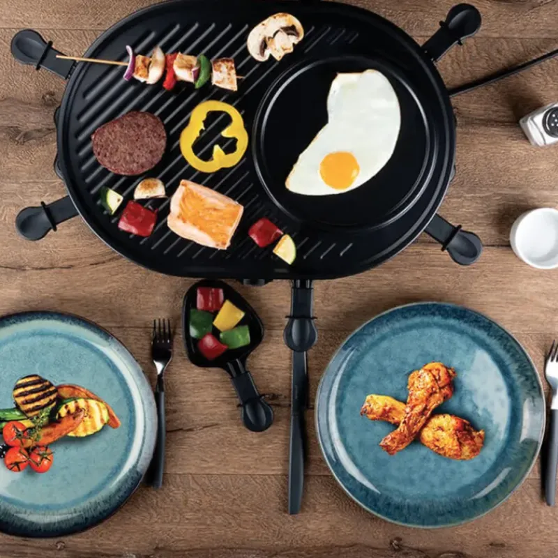 Sa plaque de cuisson antiadhésive permet de griller viandes, poissons et légumes avec précision, tandis que la fonction raclette offre à chaque convive la possibilité de faire fondre son fromage à son rythme, dans des poêlons individuels. Grâce à une puissance élevée et une répartition homogène de la chaleur, chaque ingrédient est cuit à la perfection.